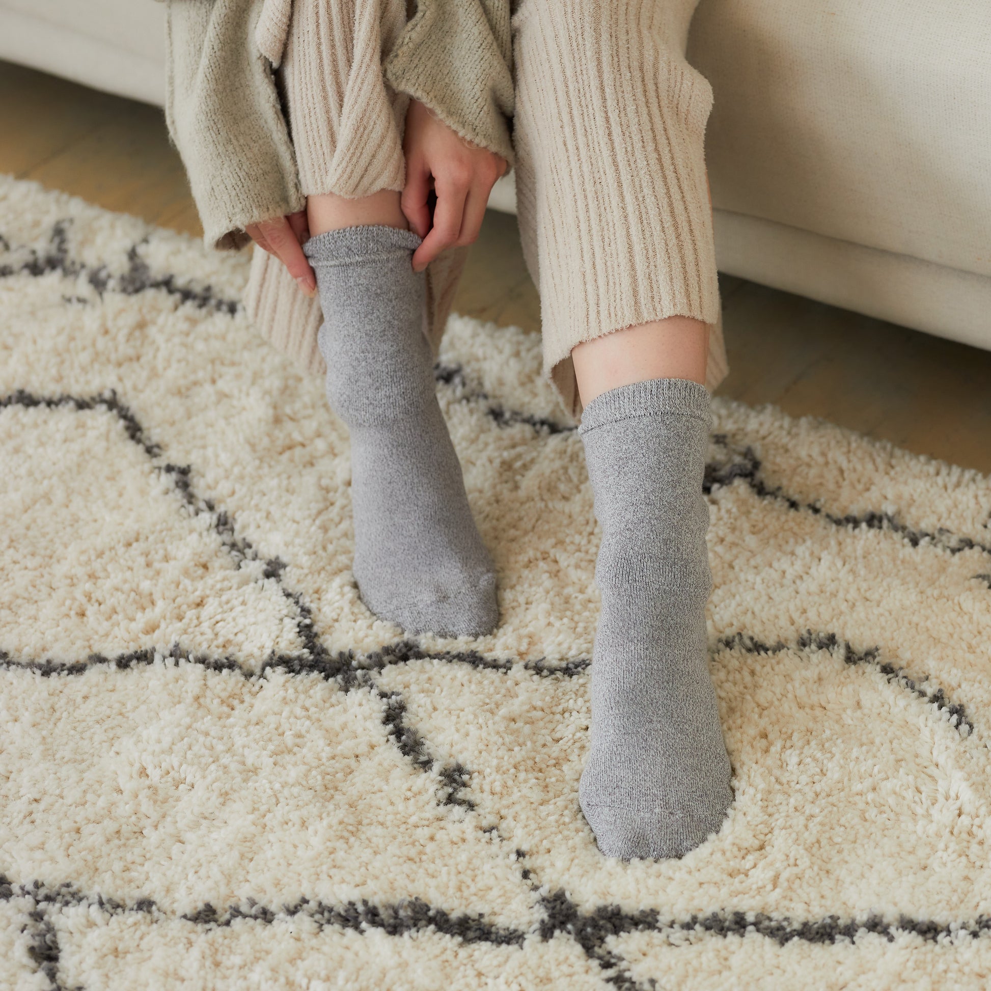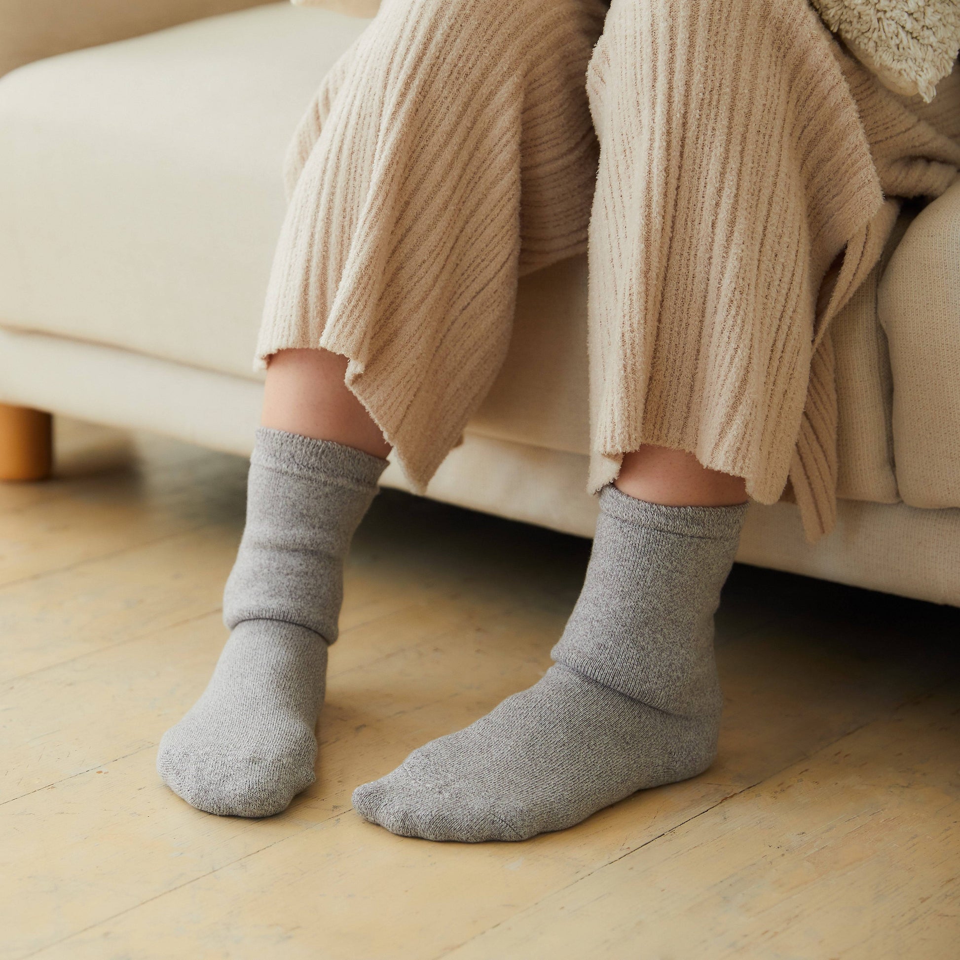 温泉由来のミネラルIFMC.(イフミック:集積機能性ミネラル結晶体)加工。タオルのようにループを立てたパイル編みで、クッション性・保温性・吸水性に優れています。空気をたっぷり含むため軽くてやわらかく、ふんわりとした肌ざわりと弾力のある履き心地が特長。汗もしっかり吸収し、蒸れにくく快適です。