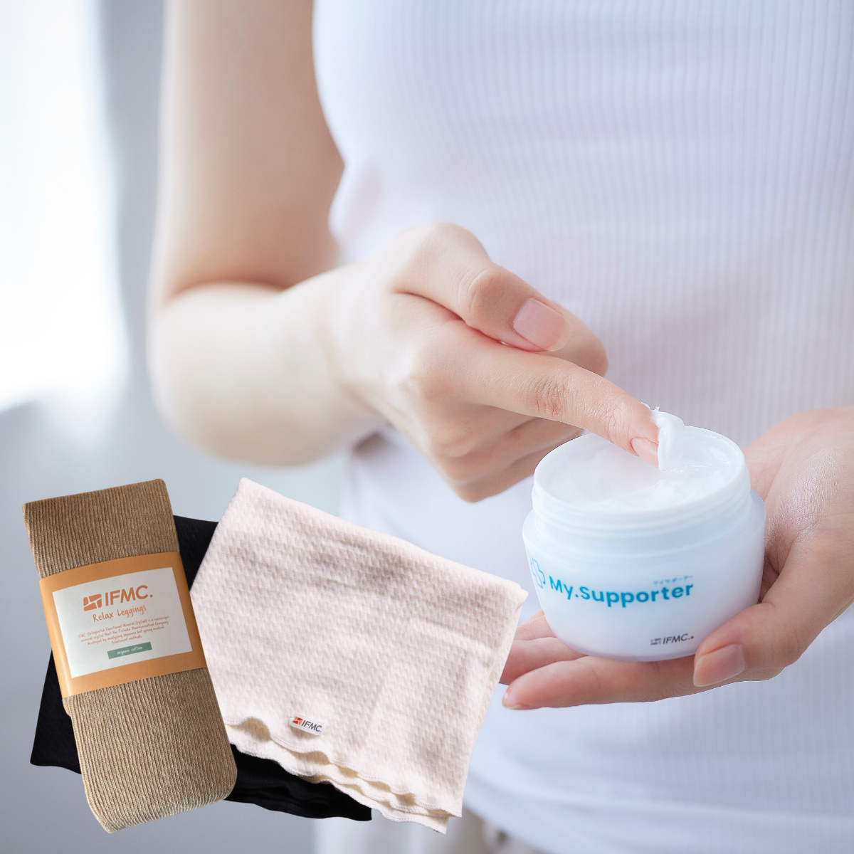 心地よさと快適さを大切にしたアイテム(My.Supporter ミネラルケアクリーム&IFMC.(イフミック)オリジナル リラックスレギンス&IFMC.(イフミック)オリジナル 腹巻き(薄手タイプ))をセットにしました。