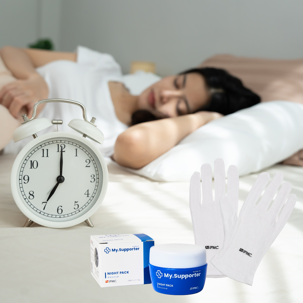 肌と手元をやさしく包む、夜のためのケアアイテム(My.Supporterナイトパック&IFMC.(イフミック)オリジナル ナイト手袋)をセットにしました。